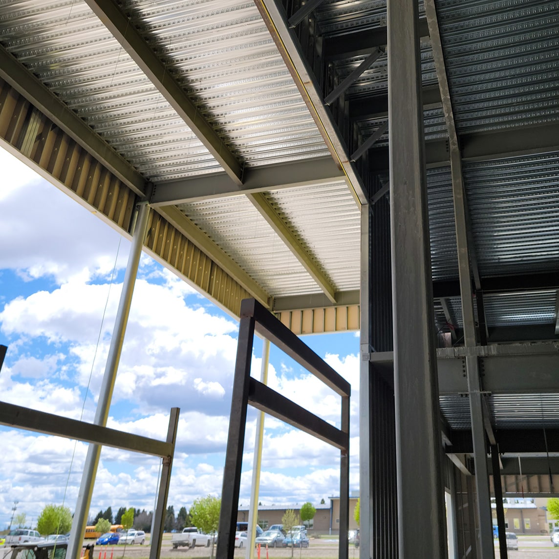 - Large-span steel transfer girders (50+ ft.) to support the main lecture hall without columns interrupting views or seating layouts.